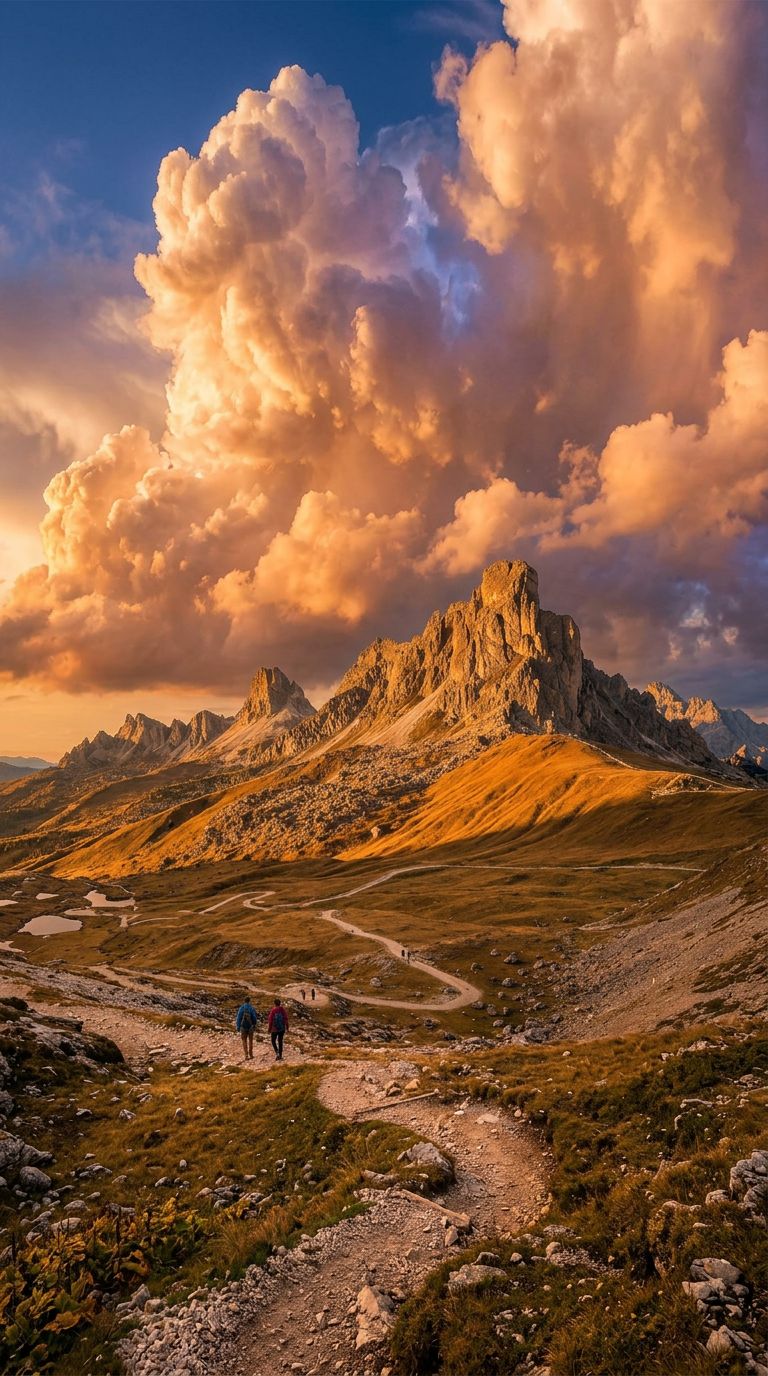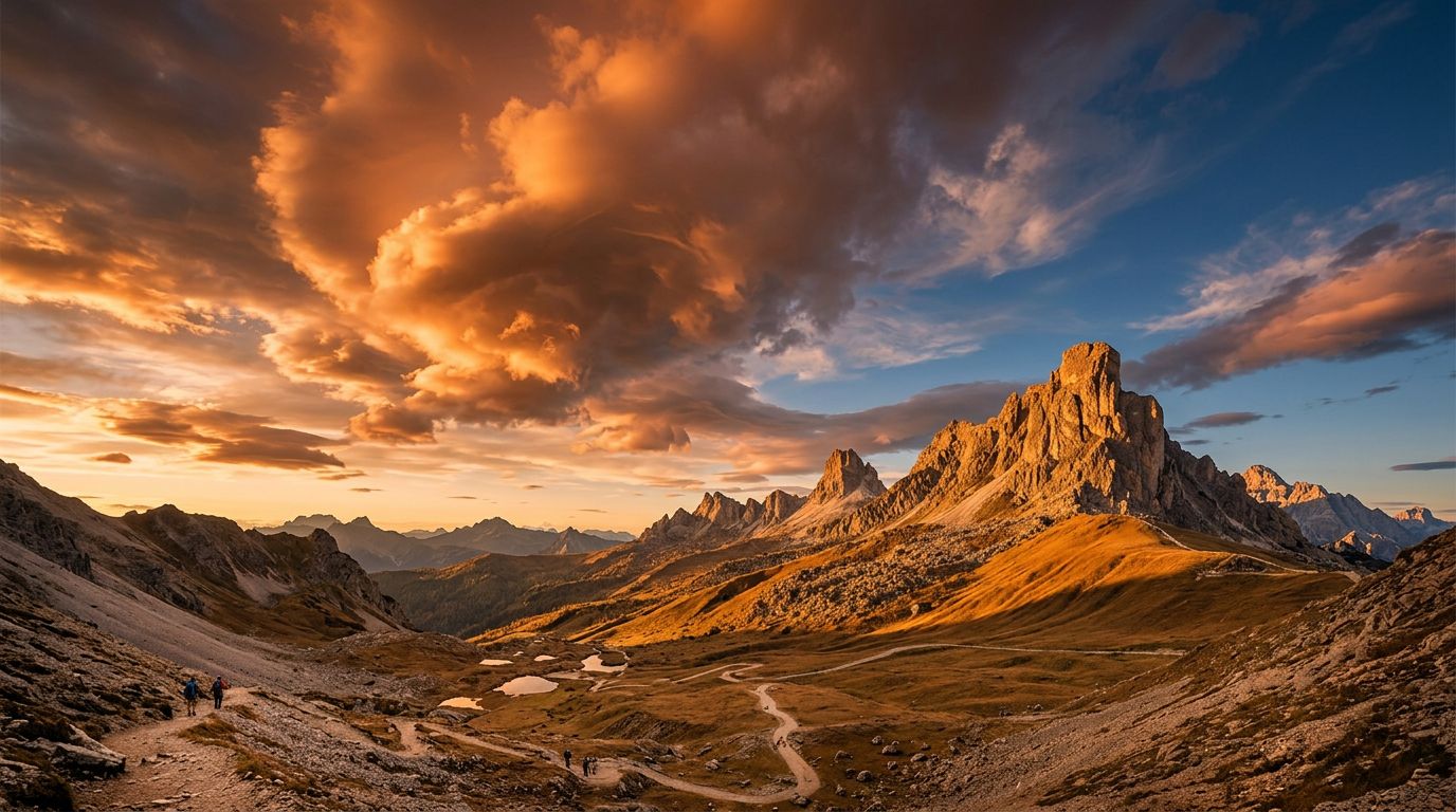 | "A beautiful landscape" | "Wide 16:9 landscape: mountain range fills the upper third, wildflower meadow in lower two-thirds, dirt path leading from bottom center to mid-frame" |