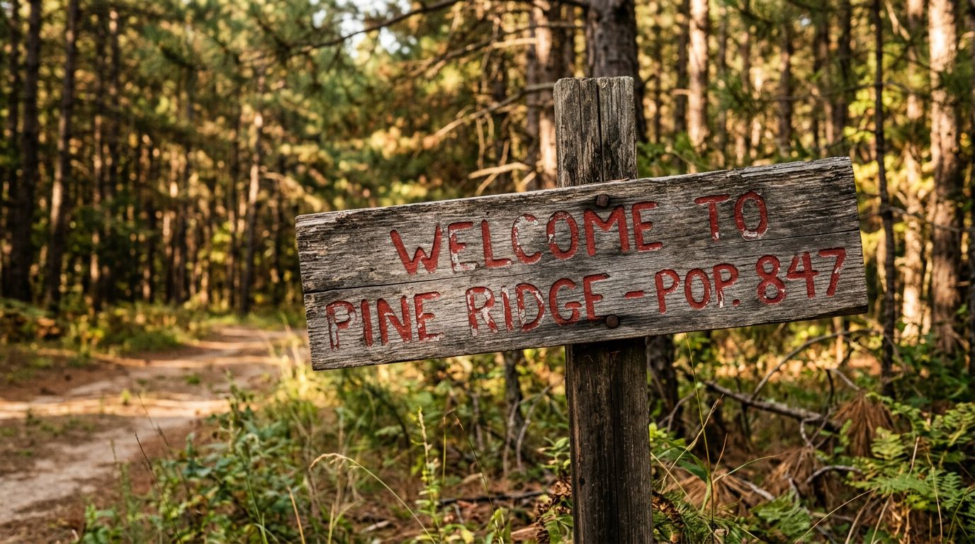"WELCOME TO PINE RIDGE - POP. 847" in faded red paint. Some