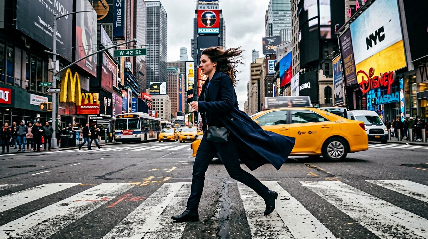 A woman mid-stride crossing a busy intersection, hair caught