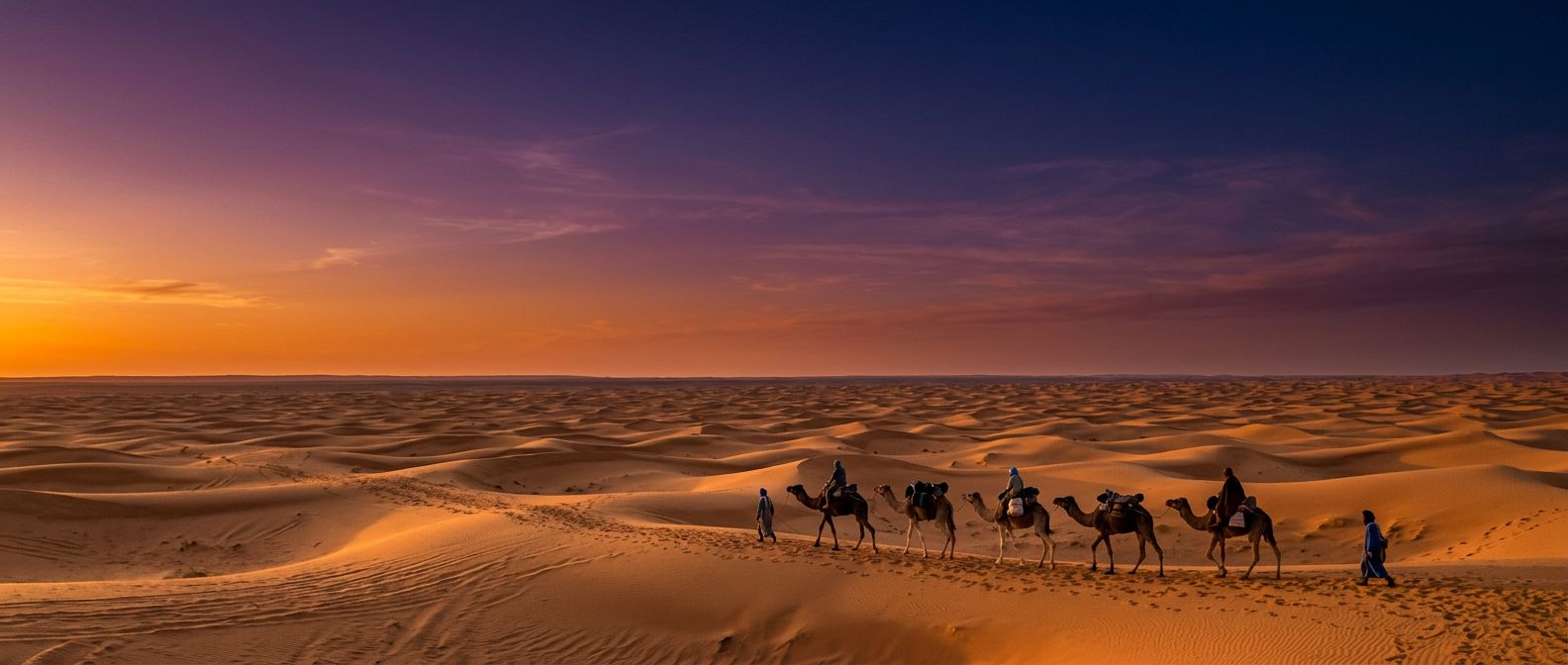 Panoramic landscape: A caravan of six camels crosses a vast