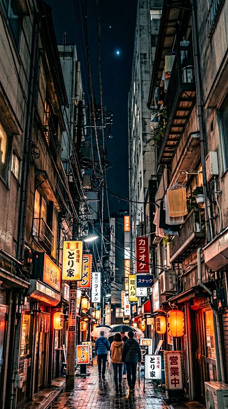 in Tokyo at night. At the bottom, wet cobblestones reflect neon.