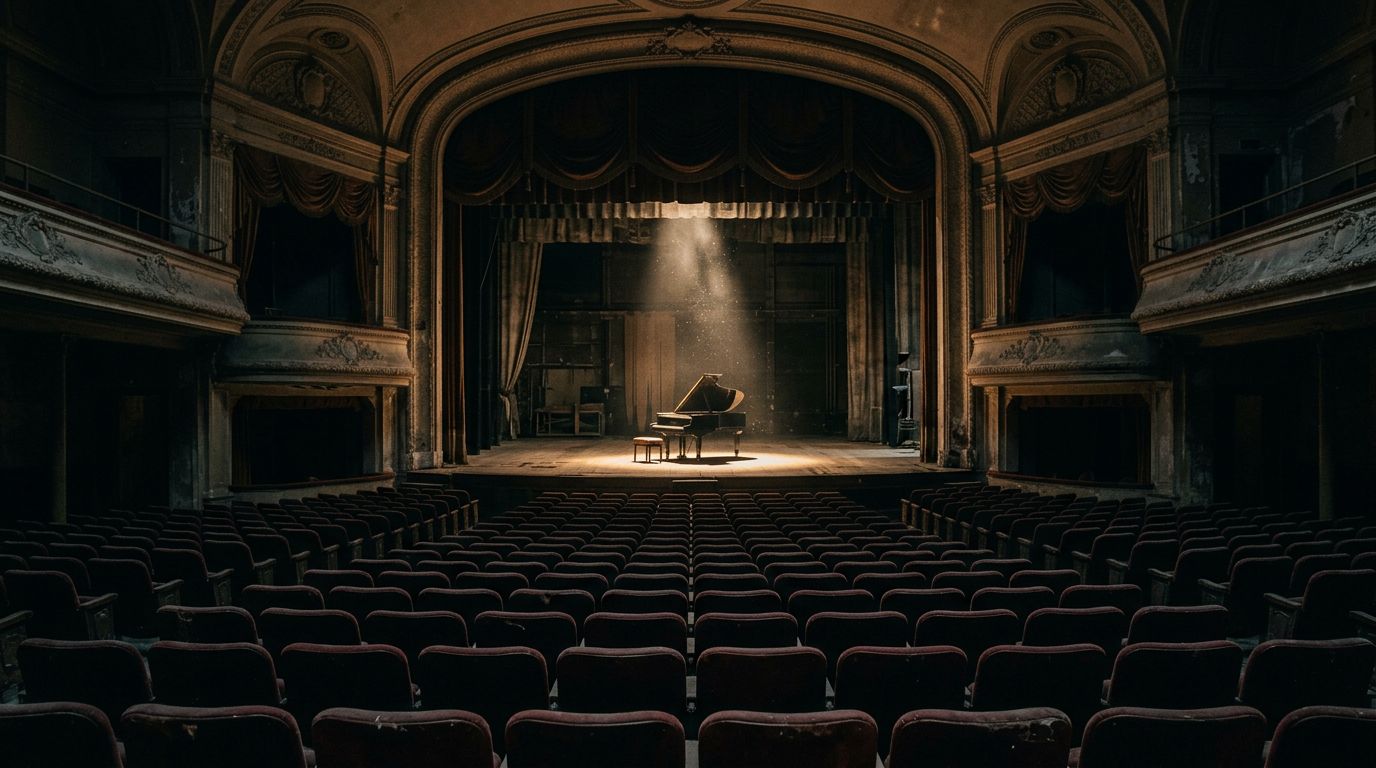 illuminates a grand piano at center stage. Rows of empty