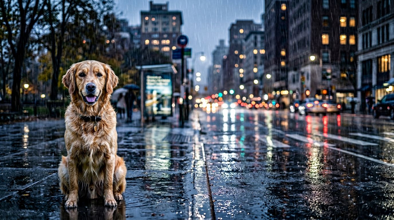 the far left of frame on a rain-slicked pier. The right two-thirds