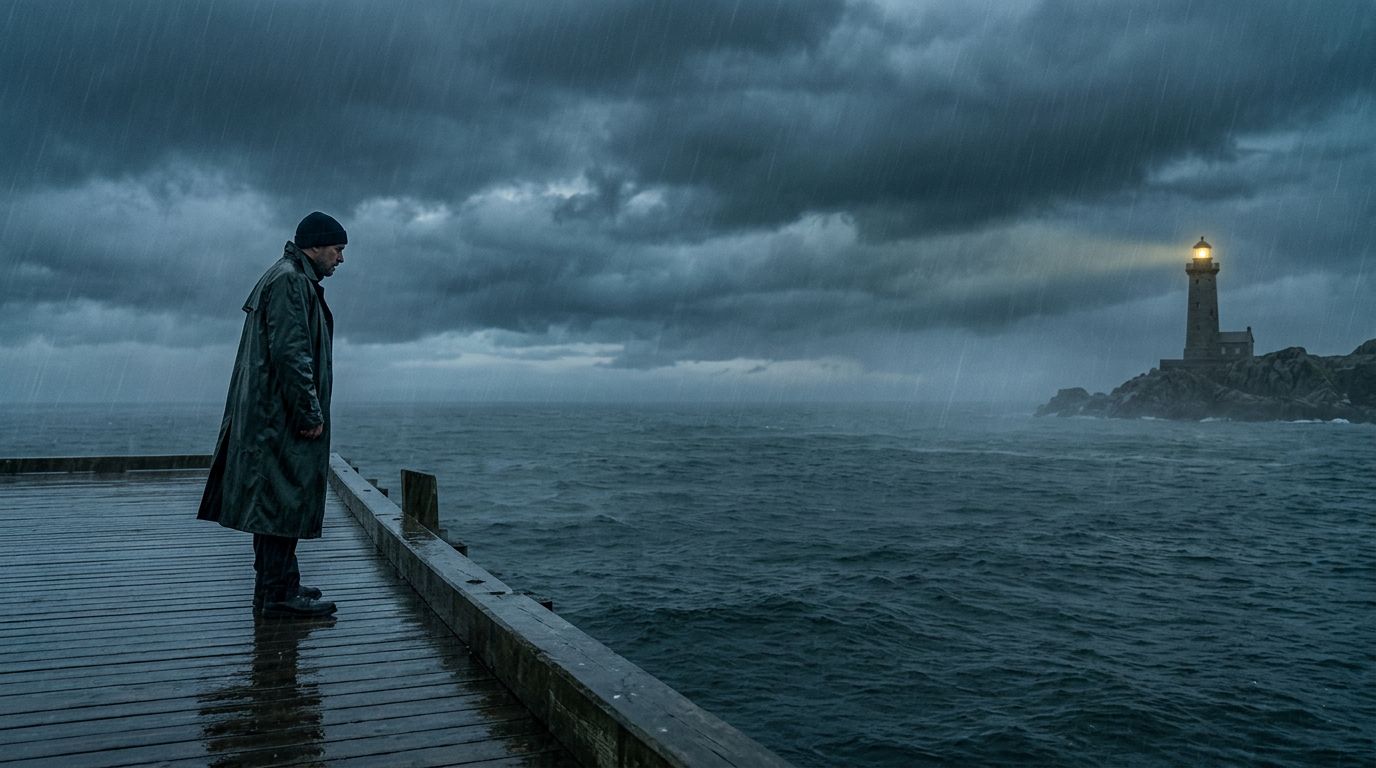 lighthouse burns in the distant background, positioned at the